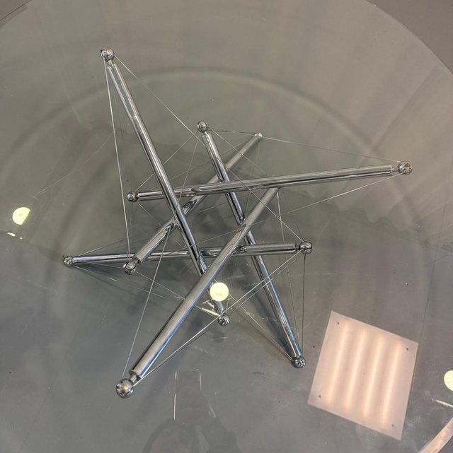 Runder Glastisch 714 von Theodore Waddell, entworfen 1973 für Cassina – ein einzigartiges Designerstück für Liebhaber von Mid-Century und modernem Design. Die skulpturale Konstruktion mit sechs Beinen schafft eine optische Leichtigkeit: Drei Beine tragen die Glasplatte scheinbar schwebend, drei berühren sanft den Boden. Inspiriert von der Architektur moderner Membranbauten, verbindet dieser Tisch Ingenieurskunst mit ästhetischer Eleganz.